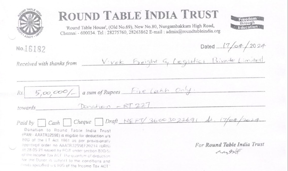 • 1. Contribution from Round Table India (PNG Siksha Funds) was Rs 7 Lakhs.